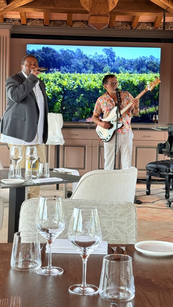 Nydelig mat, en duo som spilte og sang underveis, en restaurantsjef som både ønsket alle velkommen og sang et par jazz-låter, og svært servile jenter og gutter i serveringen.