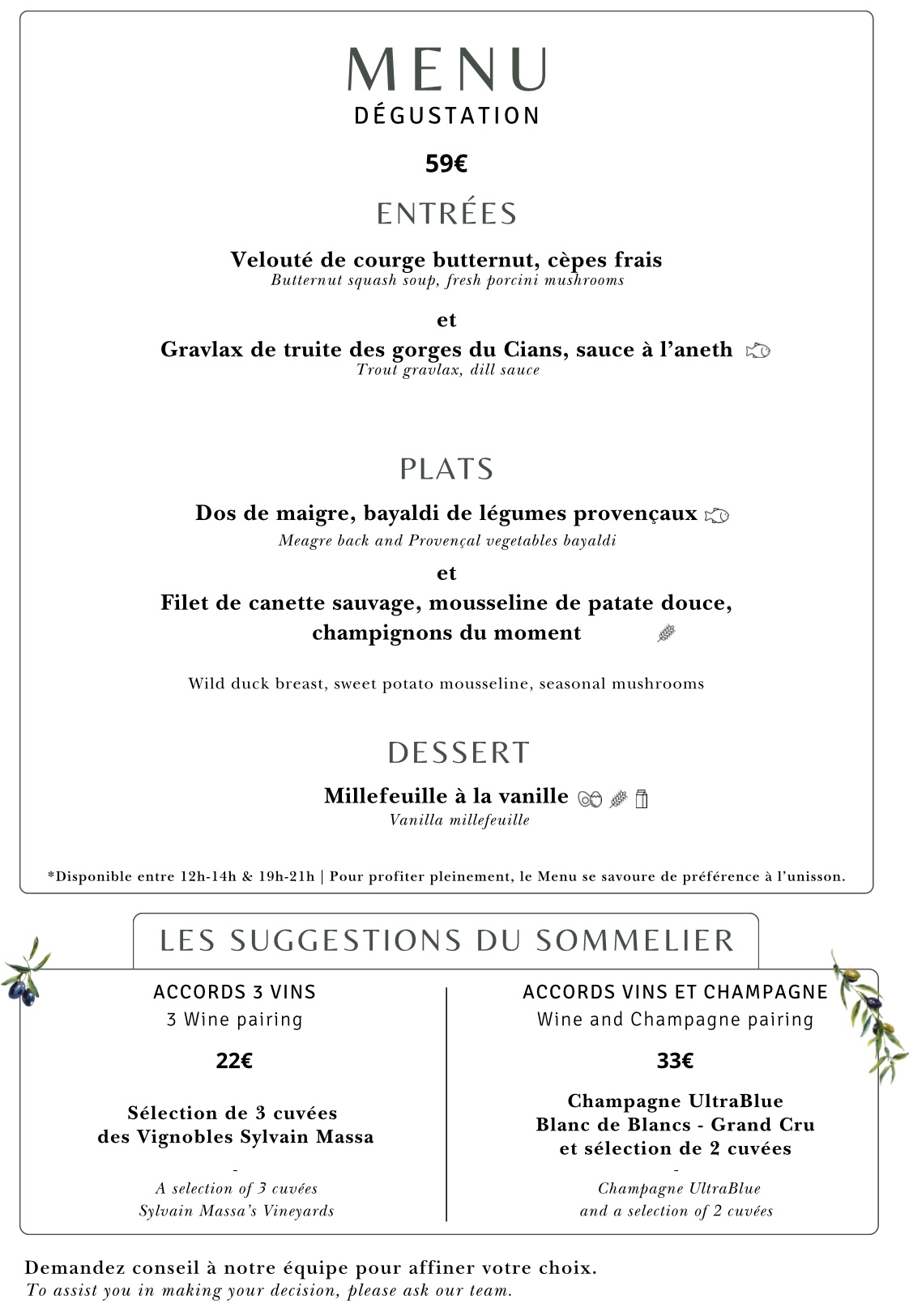 Etter vinprøving var det tid for lunch, og vi valgte en seks retter degustationsmeny med vinpakke. Det var en del folk der da vi kom inn i restauranten, men underveis i måltidet ble det neste fullt. Men vi er klar over franske familier gjerne spiser lunch ute på søndager.