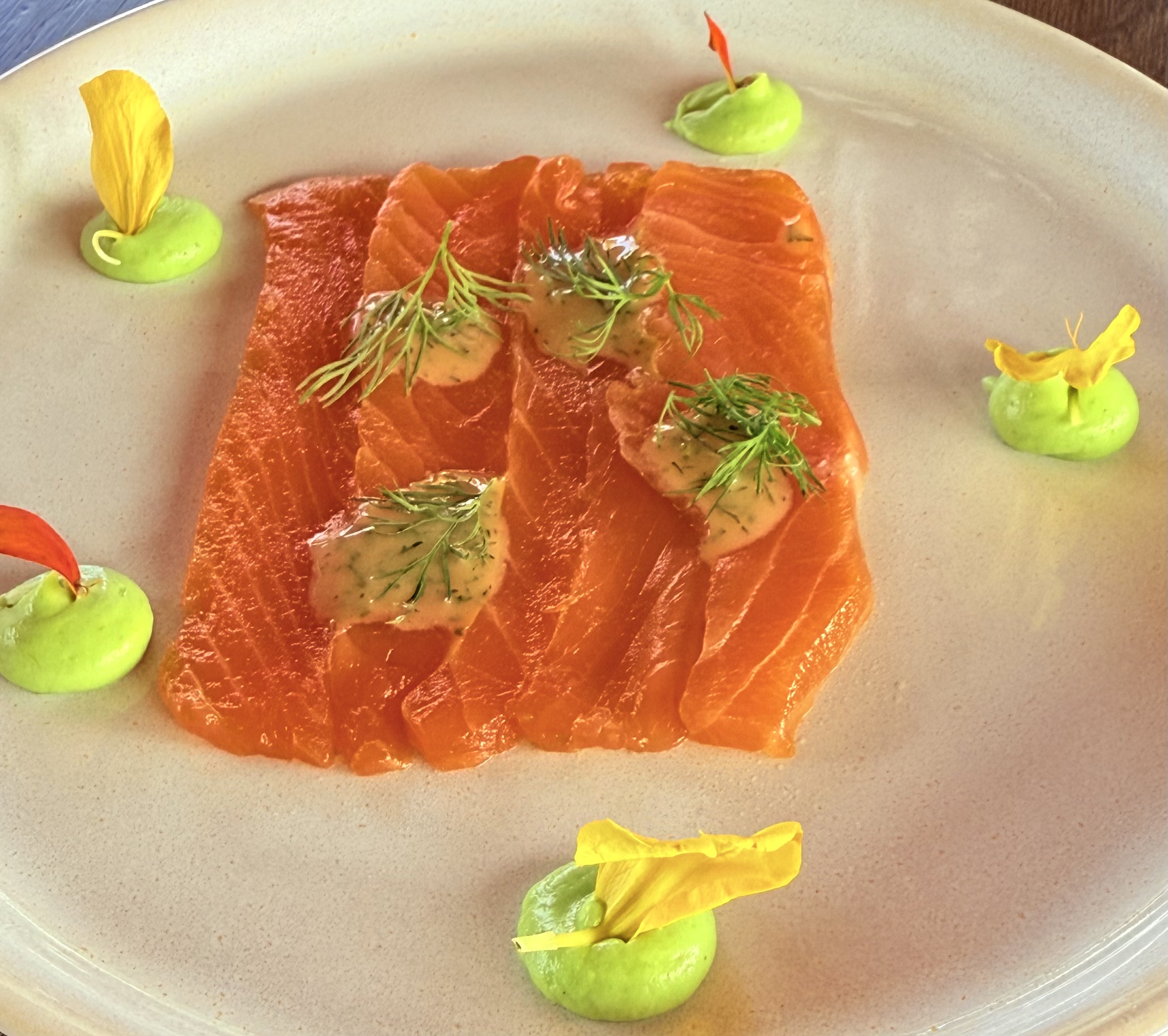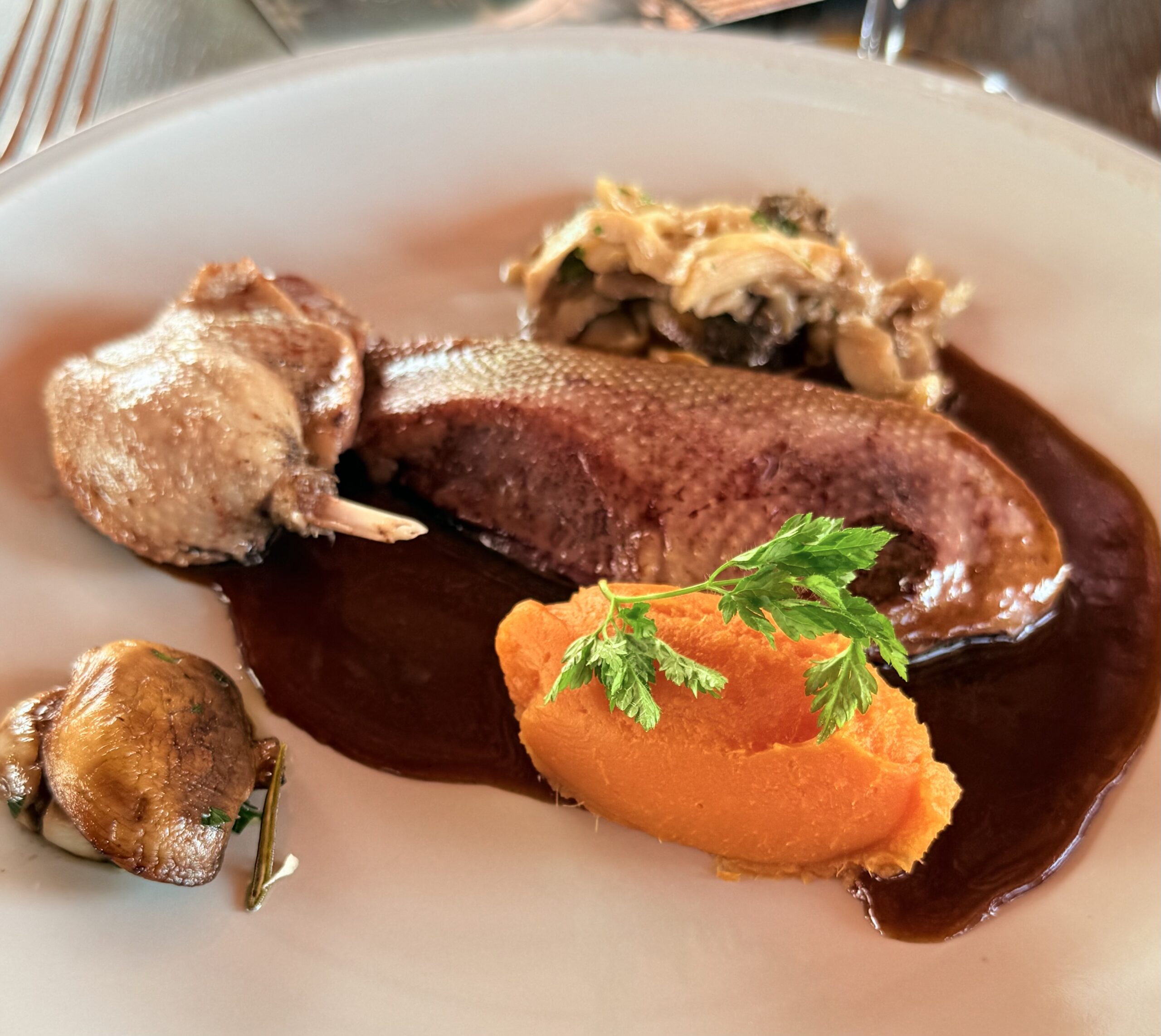 Nydelig mat, en duo som spilte og sang underveis, en restaurantsjef som både ønsket alle velkommen og sang et par jazz-låter, og svært servile jenter og gutter i serveringen.