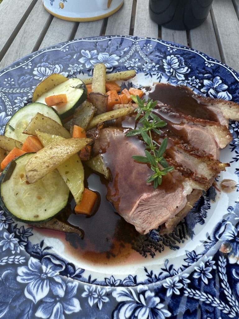 Jeg hadde ikke 20 egg, men et andebryst. Det skulle fruen og jeg ha til middag. Sammen med litt oppskjært potet, en gulrot, noen skiver squash og litt kirsebærsyltetøy.